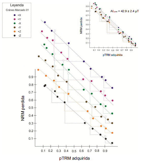 La determinación de arqueointensidades se realizó por medio de experimentos tipo Thellier-Coe (Thellier y Thellier, 1959; Coe, 1967), utilizando para ello un horno ASC Scientific TD48-SC. Se realizaron diez pasos dobles de temperatura que fueron distribuidos a través del intervalo total de temperatura empleado (25ºC - 540ºC), con una reproducibilidad de ± 2ºC entre dos calentamientos a la misma temperatura. La intensidad de campo de laboratorio se estableció en 45 ± 0.5 μT. Se añadieron al procedimiento de laboratorio las pruebas conocidas como pTRM check’s cada tercer paso de temperatura, así como las conocidas como pTRM Tail checks (Riisager y Riisager, 2001) a 2 temperaturas intermedias (350 y 450 ºC). El análisis de las determinaciones se llevó al cabo por medio del software ThellierTool 4.11 (Leonhardt et al., 2004).