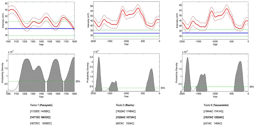 Cuatro de las cinco muestras pertenecientes al departamento de Rocha muestran intensidades similares, entre los 38.1 ± 7.7 µT y 42.9 µT ± 2.4 µT, con una datación arqueomagnética de ~ [1600AEC - 1250AEC]. Dos de éstas (CM01 y tiesto 5) presentan una correlación bastante buena con dataciones previas por 14C reportadas en Castiñeira et al. (2010) y Capdepont et al. (2016). Sin embargo, las edades 14C calibradas para las otras dos muestras (CM03 y tiesto CO13) son más tardías que sus correspondientes dataciones arqueomagnéticas. En este punto vale la pena recordar que se están datando materiales diferentes: carbón vegetal, por un lado, y la propia cerámica, por el otro lado, en el primero de los casos (muestra CM03). Para el segundo caso (tiesto CO13), se están datando materia orgánica en un sedimento y, nuevamente, la propia cerámica. La quinta de ellas (tiesto CO08) presenta, sin embargo, un valor ~ 40% más bajo que las otras cuatro muestras, para el cual no fue posible estimar un intervalo de edad confiable.
