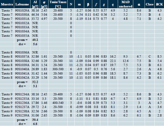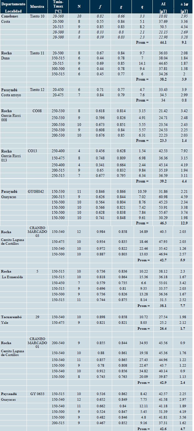 Las arqueointensidades obtenidas del total de las muestras analizadas varían entre (23.3 ± 1.4) μT y (42.9 ± 2.4) μT.