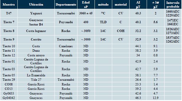 Tres cerámicas provenientes del sitio Guayacas (Departamento de Paysandú) muestran intensidades similares, con una variación entre (40.1 ± 5.6 y 46.3 ± 12.9) µT. Cabe destacar que estas muestras son las únicas que pertenecen a momentos más tardíos (Capdepont, 2013), siendo las cronologías propuestas para las mismas [1471EC - 1656EC], las cuales corresponden bastante bien con las cronologías obtenidas por TL.