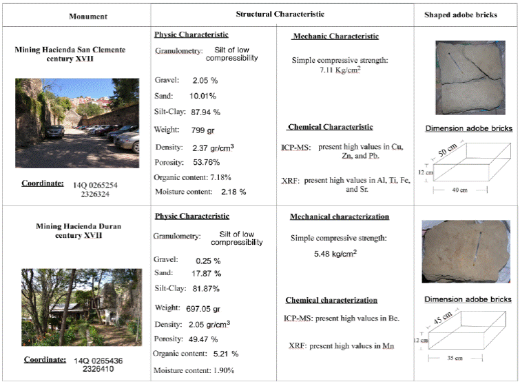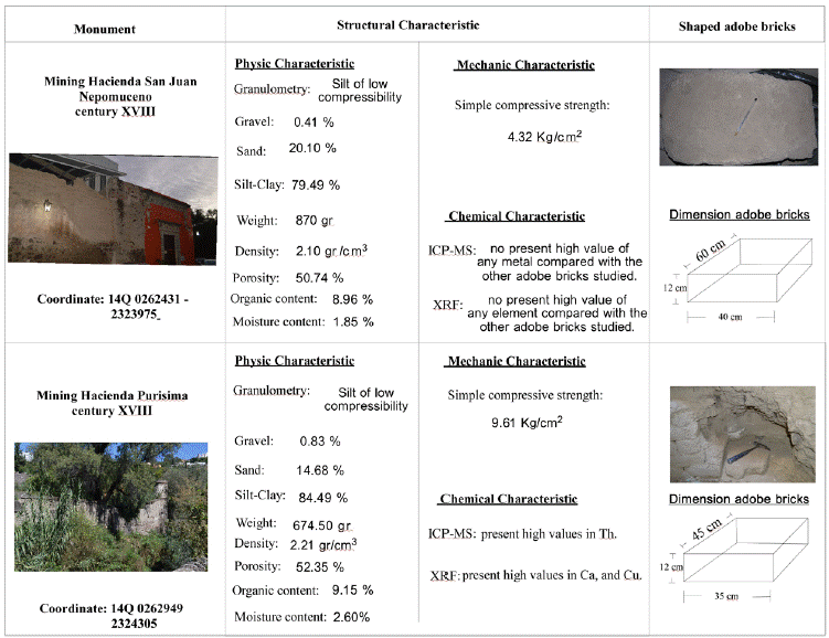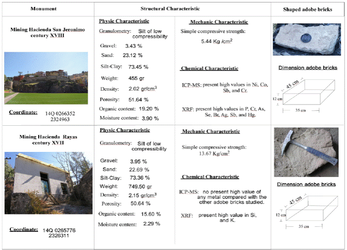 This may be due to the presence of: the materials used; manufacture processes; and dominate conditions. All of these mechanisms led to the creation of different deterioration forms, such as unequal settlements, collapsing because of the internal architectural features, and water saturation. In terms of the results obtained from the haciendas of mining, we can say that there were no great differences as to the composition of the materials, except for the presence of metals in the hacienda of benefit. We recommend that for greater theoretical and practical knowledge about adobe haciendas mining, it is necessary to analyze various samples from different mining districts and of different periods.