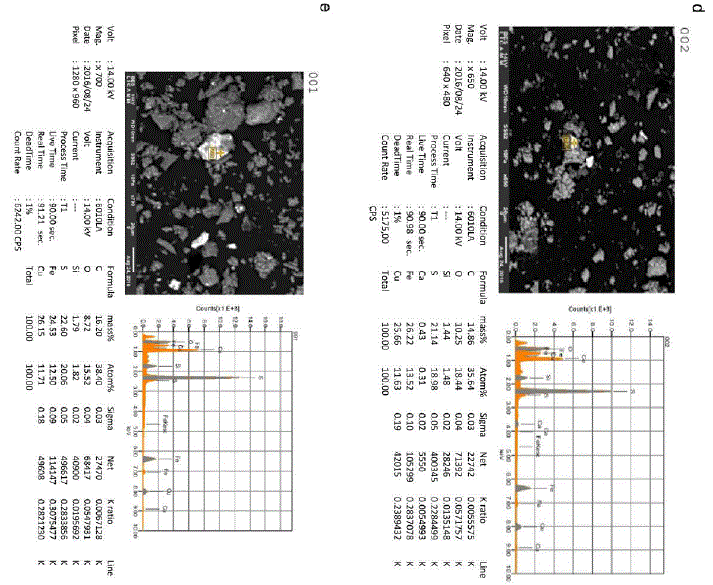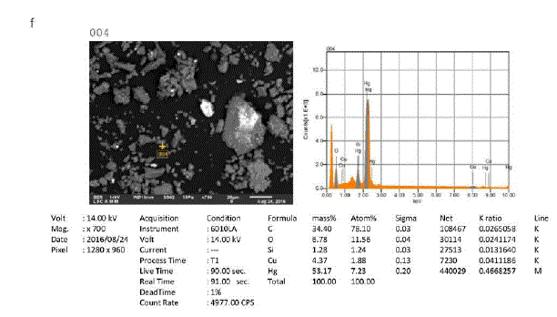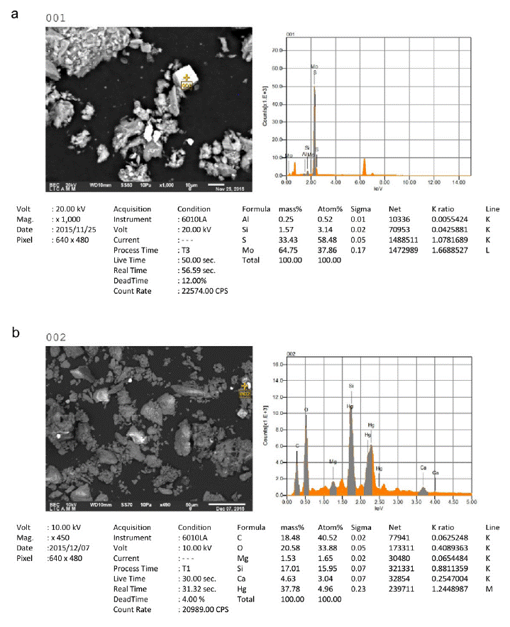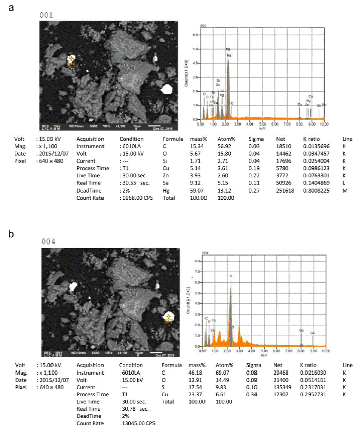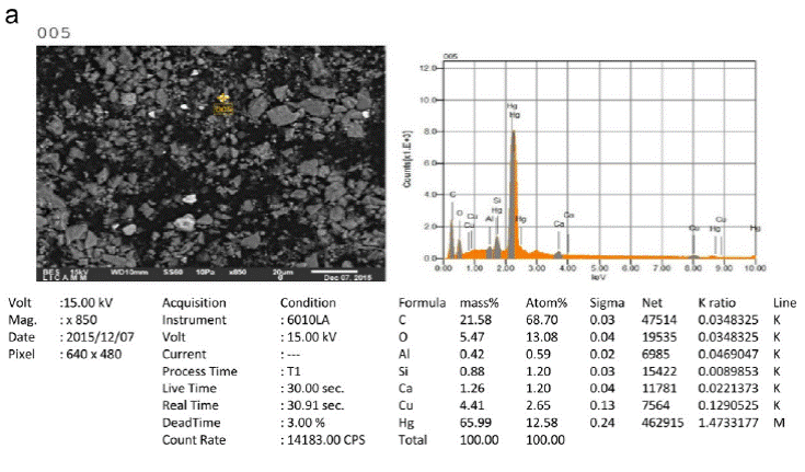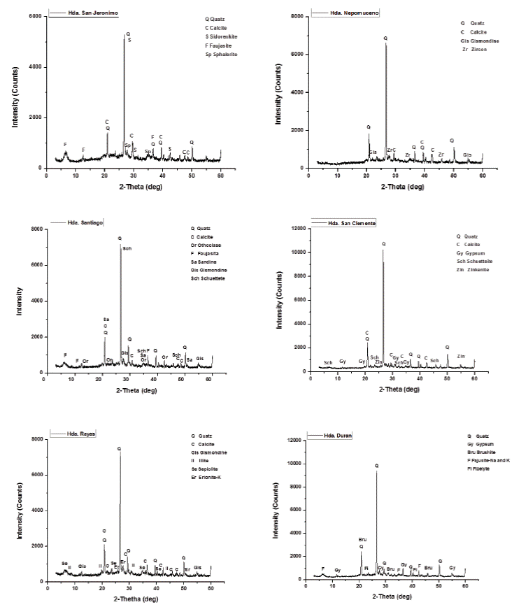 The analyzed samples contain different types of crystalline minerals, such as: Quartz (SiO2), Calcite (CaCO3), Orthoclase ((K, Ba)(Si, Al)4O), Sanidine K(Si3Al)O8, Zircon ZrSiO4, Faujasite (Na2, Ca, Mg)3.5[Al7Si17O48]·32(H2O), Erionite (Na2,K2,Ca)2Al4Si14O36·15H2O, Gismondine (CaAl2Si2O8·4(H2O), Dickite (Al2Si2O5(OH)4, Illite (K, H3O)(Al, Mg, Fe)2(Si,Al)4O10[(OH)2,(H2O)], Schuetteite (Hg3(SO4)O2), Sphalerite ((Zn, Fe)S), Fizelyite (Pb, Ag)8 Sb11 S24, Sidorenkite Na3Mn(PO4)(CO3), Sepiolite Mg4Si6O15 (OH)26 H2O, Zinkenite Pb9Sb22S42,Brushite CaPO3 (OH)2H2O and gypsum (CaSO4·2H2O) (Table 6 and Figure 5).