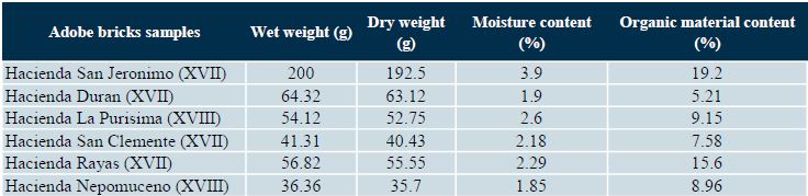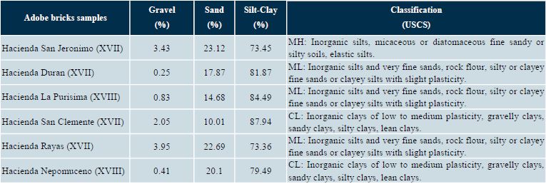 Adobe bricks are one of the oldest and most commonly used materials in construction. The use of adobe is very common in Latin America, Africa, the Indian subcontinent and other parts of Asia, the Middle East and Southern Europe. The results of the present study indicate that the adobe bricks of the seventeenth and eighteenth-century buildings in Guanajuato city are texturally similar. The analysis of particle size indicates that sizes, silt and clay are the predominant component in the matrix of the adobes studied, the percentages of clay are high, exceeding 87% (Table 1); the fact that fractions of fine, very fine and slime sands are dominant, with a moderate amount of organic matter (Table 3), which gives these materials high erodibility and a potential risk to be eroded by water, especially in the rainiest areas. Taking into account the degree of consolidation and compaction of presenting the adobes attenuates this risk, if only for a while. Finally, the similarity of these materials in their distribution and particle size (Figure 1) suggests that there was a careful selection of raw materials for the production of adobes and control in production. Similarly, we can see that the buildings of the seventeenth century have greater particle size diversity, and according to the USCS, they correspond to three types of soil: MH, ML and CL, while the eighteenth-century ones correspond to two types of soil: ML and CL, and XXth-century buildings are the type of soil: ML (Table 1).