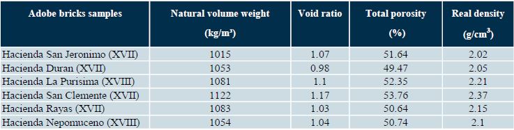 The real density and total porosity are shown in Table 2. The adobe samples showed similar density values in terms of bulk density, the range of values shown by the bricks studied is 2.02 to 2.37 g/cm3. Porosity is an important parameter due to its influence on properties, such as: chemical reactivity, mechanical strength, durability and the overall quality of the brick. The porosity of adobe bricks studied varies from 49.47 to 55%.