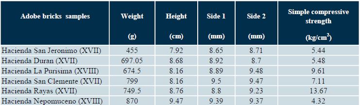 For the experimental test campaign, a set of six samples of different types of adobe construction belonging to the 17th and 18th centuries was selected. Based on this, six mining haciendas (San Juan Nepomuceno, San Clemente, Duran, La Purisima, San Jeronimo and Rayas) were chosen, distributed in different points of the city of Guanajuato (Figure 1). The samples were constituted, whenever possible, by whole blocks of adobe, whose dimensions were 0.45 m x 0.35 m x 0.12 m. The blocks studied were part of the hacienda’s galleys, a space designed to grind the ore by means of stone mills moved by mules. According to the catalog of historic buildings (Camarillo-Ramirez and Cortez-Barroso, 2015), we can say that the mining haciendas were built in the late seventeenth and early eighteenth century. These consisted of a chapel, gallery, mills, one or more wash tubs, water wheel, warehouses, barn, chambers, ovens, and stables.