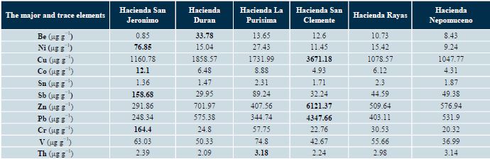 The Hacienda San Clemente has the high values in Cu (3671.18 μg g−1), Zn (6121.37 μg g−1) and Pb (4347.66 μg g−1). In Hacienda Rayas and Hacienda San Juan Nepomuceno, the values are low, when compared to other samples analyzed. Heavy metal concentrations from the adobe samples display a wide range of values. Among the analyzed metals are Ni, Cu, Co, Sb, Zn, Pb, Cr and V showing a higher range of variability, while Be, Sn and Th are the least variable. The selecti vity sequence of metals in the adobe studied were Zn>Cu>Pb>Cr>Sb>Ni>V>Be>Co>Sn>Th.