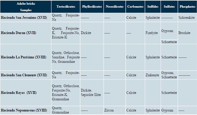 The presence of Quartz (SiO2) is attributed to the waste generated after the beneficiation process, and to the use of some sand particles as an additive material in brick manufacturing. Calcite is the result of the addition of sodium carbonate and calcite during the mineral beneficiation process by the amalgamation method. The presence of Schuetteite (Hg3(SO4)O2), Sphalerite ((Zn, Fe) S) and Zinkenite (Pb9Sb22S42) is due to the process used during the seventeenth and eighteenth centuries. An important element within the adobes is the presence of Erionite-K. The Erionite-K, which is a natural fibrous Zeolite found in certain volcanic tuffs (e.g. rhyolite tuff) and in a wide range of geological settings. Erionite-K has been used as a noble-metal-doping catalyst in a hydrocarbon cracking process and studied for its use in agricultural applications (i.e. in fertilizers and odor control in livestock production) (IARC, 1987a; NTP, 2004). The characteristics that define these bricks units are variable.