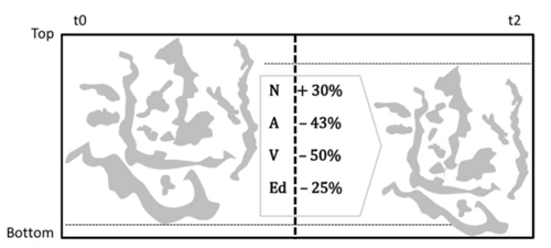In the same way, the architecture of the pores also changed. For example, the number and surface of large pores (packing pores) with equivalent diameters exceeding 2000 µm decreased (respectively from 14 ± 4.35 to 11 ± 4.79, not significantly and from 27.71 ± 14.15 to 14.65 ± 10.46, significantly). After statistical analysis, the number of pores, surface area, index of connectivity and shape factor were proposed as indicators to be monitored in the study of constructed Technosol porosity evolution (PCA, 42% for factor 1).