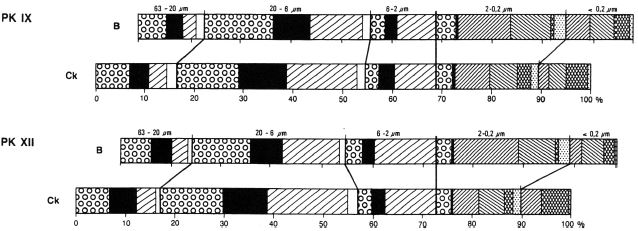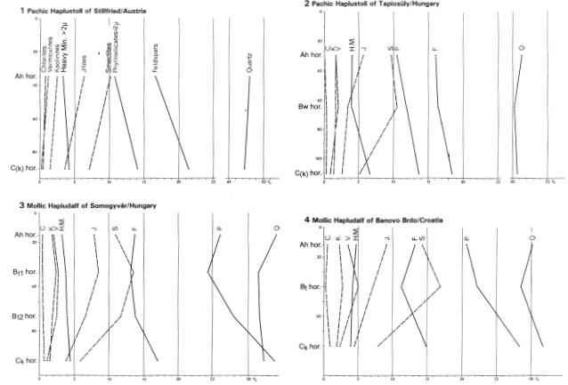 An example of the incompleteness of the loess-paleosol sequences in the Carpathian Basin is the very strongly developed F6 paleosol in Stari Slankamen, a rubefied Earthy Braunlehm- (Lessivé) in the sense of Kubiena (1956, 1959) and Smolíková (1967, 1971) (figures 1f and 1g) - with a distinct Ck partly Ckm (loess kindl) horizon. Mineralogical investigations of the silt and clay subfractions show much more pedochemical weathering and clay mineral formation than the Holocene soils in the same area (examples in figures 9 and 10): more than 40% of the feldspars and almost 80% of the micas are decomposed (Figure 11); in thin sections only muscovites are found and no biotites remained.