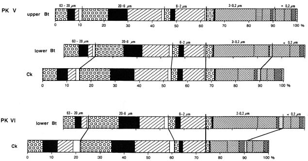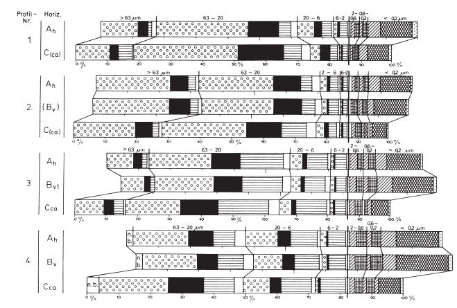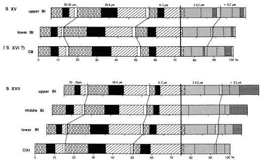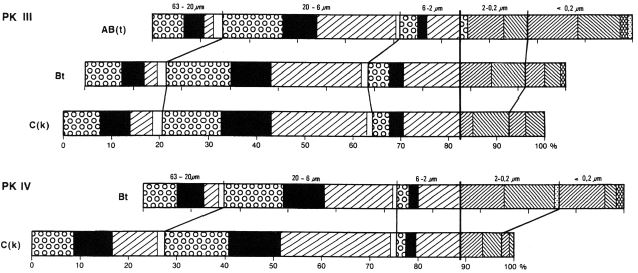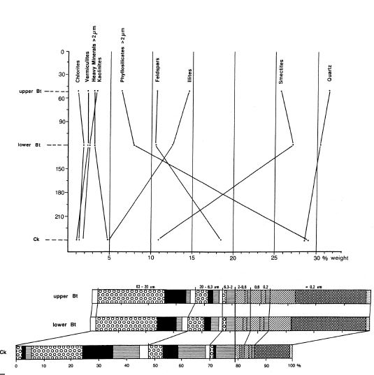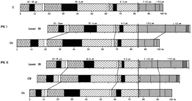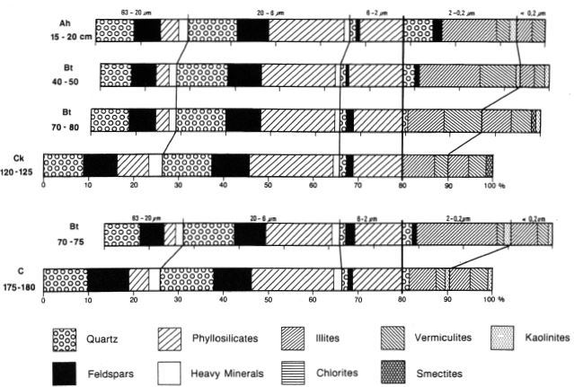 To evaluate the type and intensity of weathering it is necessary to establish the original petrographic homogeneity of the parent material from which a soil developed. One way of determining this is to use resistant minerals (Barshad, 1967). Quartz is found to be suitable because it is resistant to pedochemical weathering at least in temperate latitudes, and is always abundant in loess. Investigation details of the silt and clay subfractions are given in Brongeret al.(1998a). Figures 9 summarize the mineralogical investigations (see chapter 3.2, 3.6); the figures 9 and 11-19 contain also the particle size distribution.