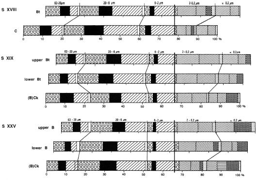 This is in agreement with e.g. the area of Southern Moravia / NE Lower Austria: in Dolni Veštonice the last interglacial soil (OIS 5.5) is a Luvisol or Typic Udalf with distinct illuviation argillans (photo 21, 22 in Bronger, 1976), whereas modern loess soils in this area are Calcic Chernozems (Fink, 1964; Hraskoet al., 1973, Bronger, 1976: Stillfried soil; table 1 in Brongeret al., 1976). A limited amount of pedogenic clay mineral formation (10-15%) is also typical for the lower paleosols of the Matuyama epoch in the Chashmanigar section, although S XIX and S XXV, which are more rubefied soils (Figure 8), seem to be more strongly developed than the other paleosols. However, the clay mineralogical composition of the Bt horizons of S XIX and S XXV could only be compared with the (B)Ck horizons immediately beneath.