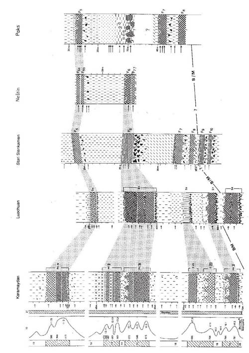 The pedostratographical correlation of the loess-paleosol sequences in Tadjikistan and Luochuan / China for the Brunhes epoch (figures 3 and 4) is mainly based on two control points. First, the B/M boundary was found in both profiles (Heller and Liu, 1982, 1984; Penkov and Gamov, 1980; Forster and Heller, 1994). Second, the lower soil of the pedocomplex S1 in Luochuan and the lower soil of the PK I in Karamaydan represent the last interglacial or stage 5.5 in the oxygen isotope record. This is supported by TL data of several authors (Nishimuraet al., 1984; Liu, 1985: 213-237; Wintle, 1987; Frechen and Dodonov, 1998).