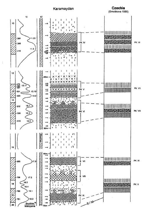 The correlation of the pedocomplexes in Karamaydan with the pedocomplexes of the composite section in Czechia (figures 5 and 6) according to Smolíková (1990) in comparison with the single profiles in the Carpathian Basin is straight forward. The two control points of the correlation are the B/M boundary found below the PK X in Czechia and the lower soil of the PK III in Czechia corresponding with the lower soil of the PK I in Karamaydan, equivalent to stage 5.5 in the OIS. The pedostratigraphical correlation allows an exact time frame of the formation of each pedocomplex in Czechia in the Brunhes chron. So, for instance, the PK IV in Czechia correlated with PK II in Karamaydan was formed in the δ18O stages 7.5 to 7.1 between 240000 and 190000 BC.
