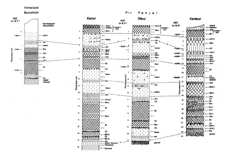 Above the last interglacial F3 paleosol in the Carpathian Basin, there is only one strongly developed paleosol F2 (figures 3 and 4). At Karamaydan and Luochuan, the upper soils of the PK I- and S1- pedocomplex are the only strongly developed paleosols formed in the early Würm period, which is chronostratigraphically equivalent to δ18O substages 5.3-5.1. However, in several loess exposures in the Central Asian Kashmir Valley (India), which today has a xeric soil moisture regime like that of Tadjikistan, three distinct Ah or Aht horizons, each 30-50 cm thick and separated by loess or loess-like sediments, are preserved above the last interglacial Bt horizon (Bronger et al., 1987; see Figure 7). They were formed in the time interval between 80 and 50 ka (Singhvi et al., 1987).