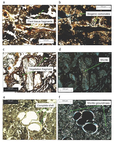 The main micromorphological components of the upper units are biogenic micrite, sparite, freshwater mollusk shells, and organic matter in the form of partly decomposed fragments of plant tissues (colloidal organic material) (Figure 10a, b). They are found in the upper units of all cores, however, proportions vary. In the organic horizons, for instance in the O1 and O2 horizons of the Media Luna SP-1 profile, plant residues with intact cellular structure are observable; some pores of these residues are filled with micrite (Figures 10c and 10d). In the calcic horizons (e.g., 3Bk horizon of the Zanja SP-1) complete shells are found in a micritic groundmass locally containing dark organic pigment (Figures 10e and 10f). These components reflect the modern seasonal flood regime.