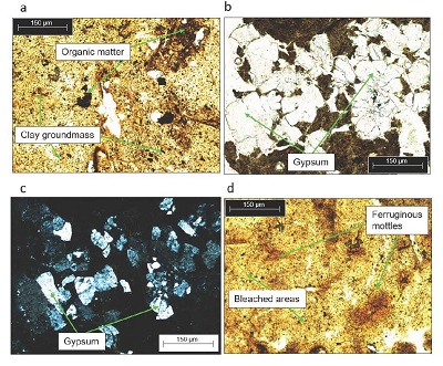 The lower units demonstrate a great variety of features and formation processes (despite appearing similar macromorphologically). Micromorphological examination of soil thin sections identified gley properties, highly organic materials with coarse-grained calcite, gypsum neoformation, and in one case, in the 4Bk horizon of Esperanza SP-2, precipitation of pyrite ( Figure 12c and 12d). None of the lower units have micritic muds, and it is therefore concluded that they were not flooded for any significant periods of time. All of the lower units, however, show signs of water saturation and swampy pedogenesis. There is evidence of gleyzation with the accumulation of organic matter (mostly well decomposed) that is partly mixed with clay. Also present are neoformed minerals that also show a hydrogenic origin. Pyrite can be formed only in a very anoxic environment, thus in water-saturated (i.e. reduced) contexts. If exposed to oxygen, pyrite forms iron oxide, and if it interacts with sulfuric acid, it can form gypsum (Miedema et al.,1974; Poch et al., 2010).