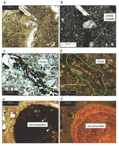 Development of gypsic pore pedofeatures is frequently associated with evaporation of gypsum-saturated groundwater (Poch et al., 2010). The key point is that gypsum is 10 times more soluble than carbonates. Thus, in these environmental conditions it is very rare for gypsum to remain undissolved in crystal form. The presence of gypsum therefore may indicate drier past conditions. However, infillings of neoformed gypsum are also known to be the oxidation product of pyrite (Miedema et al., 1974). In this case it could be related to the aeration of swampy soils where pyrite was formed earlier under anoxic conditions due to fluctuation of the water table. This latter scenario does not necessarily imply strong aridization. The discovery of framboidal pyrite in the lower unit of Esperanza SP-2 supports this version.