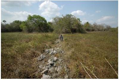 Second is exploitation of wetlands. Initial research by Fedick et al. (2000), and more recent work by Leonard (2013) and Chmilar (2013), documented anthropogenic landscapes within the wetlands characterized by constructed rock alignments of various configurations in diverse physical settings within the wetland swales (Figures 2 and 3). Twenty-six of approximately 174 wetlands have been surveyed to date, and 20 of the surveyed wetlands contain 516 rock alignments (for full details of the wetland surveys see Fedick, 1998a; Fedick et al., 2000; Leonard, 2013). Rock alignments are typically comprised of a single row of uncut limestone boulders and slabs; they range in length from 2 to 700 m (average 27 m) and average 0.46 m wide by 0.25 m tall. The alignments were originally suggested to have functioned in ancient times to modify soil and hydrologic conditions, in order to increase the production of useful wetland resources or for agricultural purposes (Fedick, 1998b; Fedick et al., 2000; Andersen, 2001). Evidence for ancient Maya wetland agriculture is well known from northern Belize (Turner and Harrison, 1983; Lambert et al., 1984; Hammond et al., 1987; Pohl, 1990; Jacob, 1995; Berry and McAnany, 2007; Beach et al., 2009), southern Quintana Roo (Gliessman et al.,1983), and Campeche (Siemens and Puleston, 1972) but usually takes the form of canals and raised fields. The use of rock alignments in the Yalahau region therefore is a different type of wetland agro-engineering, and along with rock alignments/walkways recorded by Hixon (2011), is the only documented evidence for wetland manipulation in the northern Maya Lowlands.