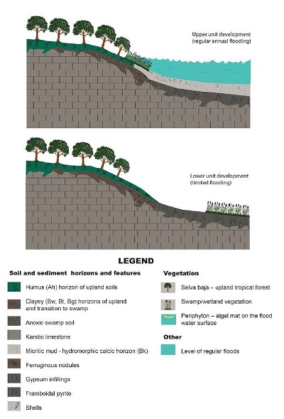 The micromorphological observations of the study cores of the Yalahau region were used to identify the various types of pedogenetic features and to distinguish two units: an upper unit dominated by biogenic micrite, and a lower unit characterized by a variety of unique soil features such as sparitic calcite crystals, pyrite, gypsum, and gleyic properties. Based on these observations, it is suggested that modern soil forming processes are fairly uniform across the region and controlled by regular annual flooding (~7 months of >1 m deep flooding each year), while in the past (Preclassic period), flooding was less regular and wetland environments were more swampy and varied.