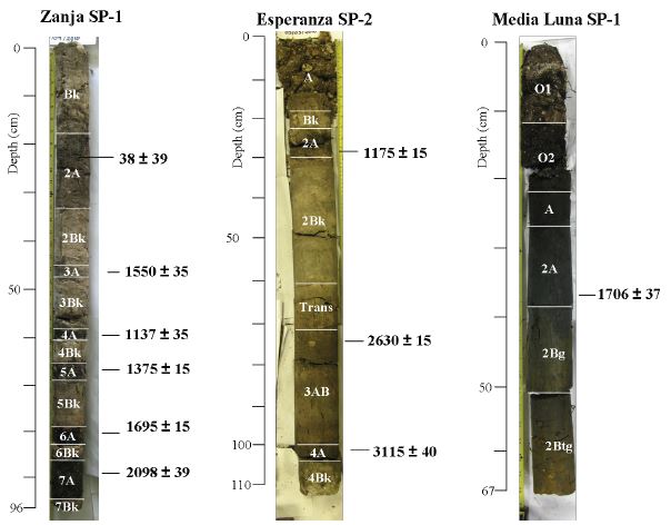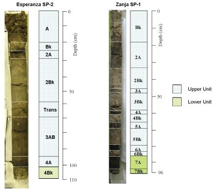Esperanza SP-2 has in the upper unit A (0-19 cm), Bk (19-22 cm), 2A (22-30 cm), 2Bk (30-61 cm), a transitional layer (61-71 cm), 3AB (71-100 cm), and 4A (100-105 cm) horizons. The lower unit is only constituted by the 4Bk horizon (>105 cm).