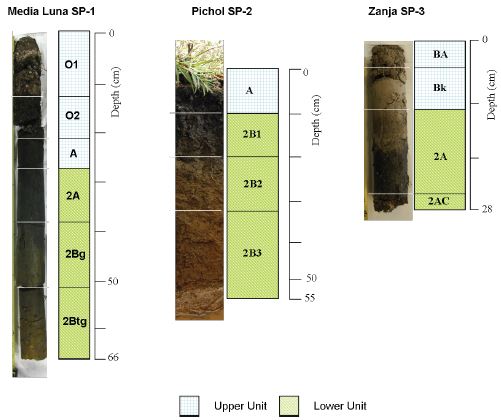 The upper unit of Media Luna SP-1 profile has O1 (0-12 cm), O2 (12-21 cm), and A (21-27 cm) horizons; while the lower unit shows the following horizons: 2A (27-39 cm), 2Bg (39-51 cm), 2Btg (51-66 cm).