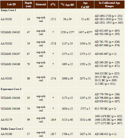Ten radiocarbon dates were collected from 3 different cores that span the past 3332 years cal BP (Table 1; see Figure 7). Due to the absence of identifiable charcoal or other reliably ancient organic materials, all dates were run on bulk organic sediment. The Zanja core is the most well-stratified sequence, with 6 dates ranging from 2073 ± 51 cal BP ([AA 92183] 205-37/344-323/11-2/30-21 BC) at the base of the core to 51 ± 82 cal BP ([AA 92181] AD 1811-1920/1692-1728/1952-1955) near the top. Aside from the date of 1457 ± 42 cal BP at a depth of 47 cm ([UCIAMS 104165] AD 432-495/503-560), the radiocarbon dates from Zanja SP-1 are in chronological order. Three dates from Esperanza SP-2 range from 3332 ± 48 cal BP ([AA 92179] 1460-1292/1493-1476/1277-1272 BC) to 1107 ± 33 cal BP ([UCIAMS 104164] AD 798-894/779-794/929-932) and are in chronological order. A single determination [AA 92180] from Media Luna SP-1 dates 1627 ± 54 cal BP (AD 248-413). We acknowledge that relying on a single date from Media Luna is problematic, and recognize there is a need for further dating of the site.