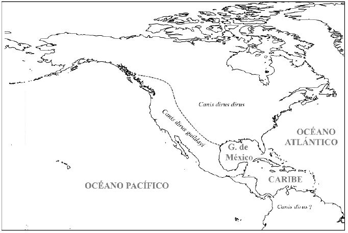 Se ha propuesto que, debido a la amplia distribución geográfica de este lobo durante el Pleistoceno, existieron varias poblaciones morfológicamente distintas en Norteamérica.Frick (1930) fue el primero que nombró dos subespecies deAenocyon(=Canis)dirus:A. dirus alaskensispara Alaska yA. dirus nebrascensispara Nebraska, sin embargo, éstas no son válidas debido a que no contaron con una descripción formal (Nowak, 1979). Más adelante, Kurtén (1984) evidenció ligeras diferencias a nivel de la talla de los huesos de las extremidades y el largo del segundo premolar superior (P2), concluyendo que los individuos colectados desde noreste de Estados Unidos hasta Canadá eran corporalmente más grandes y tenían un P2 más corto, contrariamente a los individuos colectados en México y la costa occidental de Estados Unidos. Bajo este argumento, este autor dividió a esta especie enC. dirus dirusLeidy, 1858 yC. dirus guildayiKurtén, 1984 (Figura 1).