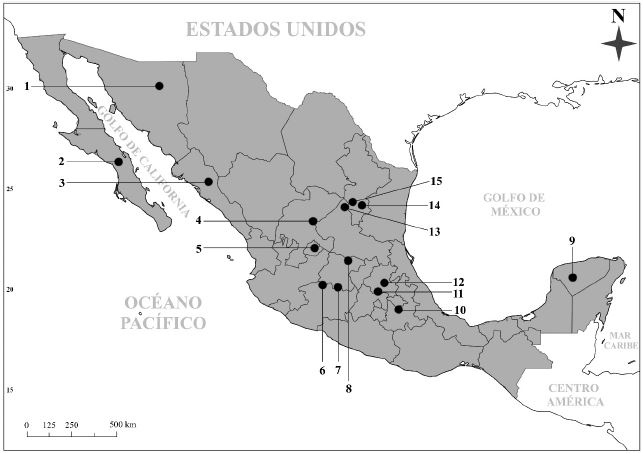 En el caso de México, a la fecha no se ha realizado ninguna revisión de los restos deC. dirusdescubiertos, y se sigue la asignación taxonómica propuesta por Kurtén (1984) (i.e.,C.dirus guildayi). México cuenta con 15 localidades donde se han registrado restos fósiles deC. dirus(Figura 2, Tabla 1). Pese a esto, Kurtén (1984) se basó, para su propuesta biogeográfica y taxonómica, solamente en los individuos de la Cueva de San Josecito, Nuevo León, y un polémico ejemplar de El Tajo de Tequixquiac, Estado de México (el cual será discutido más adelante).