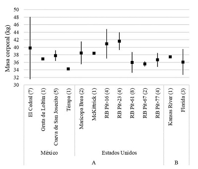 Otro carácter que describió Kurtén (1984) para diferenciar entre las subespecies deC. dirus, es un alargamiento mayor de las extremidades enC. dirus diruscon respecto a su contraparteC. dirus guildayi. Bajo esta perspectiva los miembros mexicanos y californianos deberían ser ligeramente más pequeños que sus contrapartes del noreste de Norteamérica. Sin embargo, como se mencionó anteriormente, el material mexicano es escaso para realizar esta comparación. A la falta de esta información se evaluó el tamaño utilizando una estimación de masa corporal (Figura 3) mediante la ecuación de Van Valkenburgh (1990) (véase apartado 2 del presente trabajo, Materiales y Métodos).