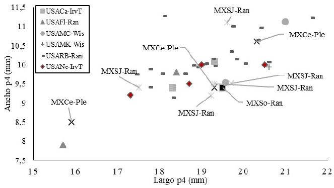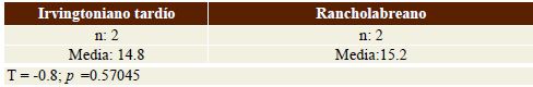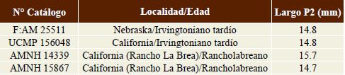 Para evaluar si existían diferencias bajo la perspectiva cronológica de Tedford et al. (2009), se tomaron los valores del P2 reportados por estos autores para miembros del Irvingtoniano tardío de Nebraska y California y se compararon con individuos del Rancholabreano de California. La prueba T (p= 0.5705) indica que tampoco hay diferencias significativas bajo este criterio cronológico (Tabla 3).