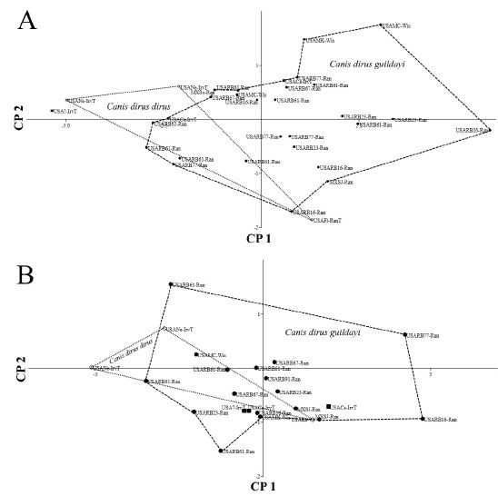 También se aplicó un análisis de componentes principales para considerar la relación entre distintas variables dentales, tanto de dientes superiores como de inferiores (véase el apartado 2, Materiales y Métodos, para la descripción de las variables consideradas). Pese a que el número de individuos asignados aC. dirus diruses considerablemente menor con respecto a los deC. dirus guildayi, no se encontraron claras diferencias entre los miembros de ambas subespecies. Esto ocurre tanto en dientes inferiores (Figura 5A) como dientes superiores (Figura 5B). En ambos casos se observaron solapamientos entre los taxones que Kurtén (1984) diferenció (véanse las áreas demarcadas en Figura 5). Tampoco se observa una distinción entre los individuos del Irvingtoniano con respecto a los del Rancholabreano o glaciación Wisconsiniana.