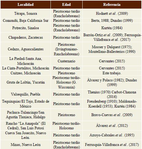 En este trabajo se presenta una actualización del estado del conocimiento de esta especie para México, y se evalúa si es posible apoyar la asignación a nivel de subespecie propuesta por Kurtén (1984). Para esto nos basamos en un mayor número de especímenes mexicanos que los utilizados por este autor, donde además incluimos ejemplares ya publicados y otros depositados en colecciones (Instituto Nacional de Antropología e Historia, INAH, en México y la del Natural History Museum, Los Angeles County, LACM, en Los Ángeles, California, Estados Unidos).