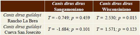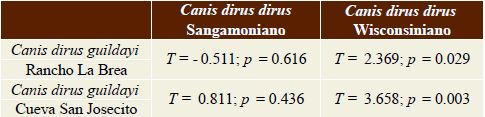 Kurtén (1984) definió aCanis dirus diruspor tener el P2 más corto queC. dirus guildayi. Para este argumento, el autor realizó una prueba estadística bajo la cual reportó que existían diferencias significativas entre ambos grupos. Retomamos los datos que este autor utilizó, y bajo una prueba de T encontramos que no existen diferencias significativas entre los individuos de Rancho La Brea y Cueva de San Josecito (C. dirus guildayi) con respecto a los individuos reportados del noreste de Estados Unidos para el interglaciar Sangamoniano (C. dirus dirus). Pero sí se encontraron diferencias significativas entre los miembros deC. dirus guildayicon respecto a losC. dirus dirusde la glaciación Wisconsiniana (Tabla 2).