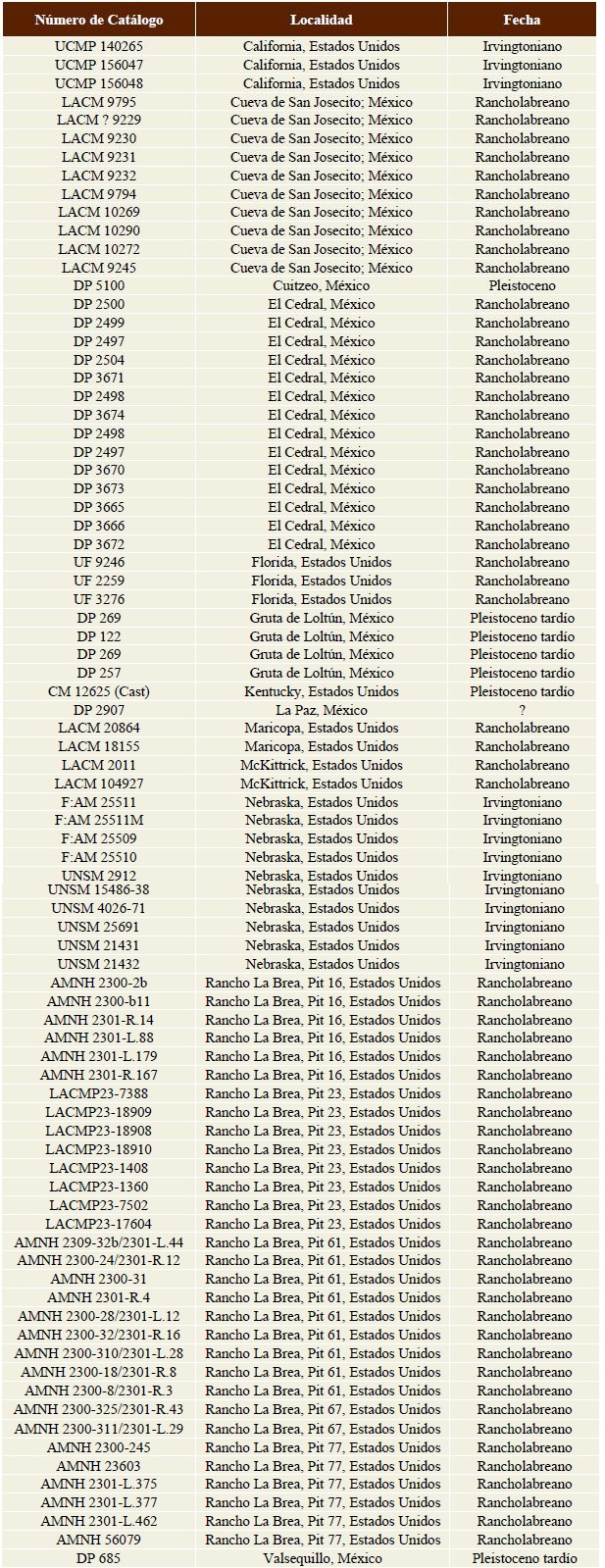 Se tomaron datos morfométricos de los ejemplares depositados en las siguientes colecciones: Colección Nacional de Paleontología, Instituto de Geología (IGM), Ciudad de México, México; Florida Museum of Natural History (UF), Gainsville, Florida, Estados Unidos; Instituto Nacional de Antropología e Historia, Departamento de Prehistoria (INAH, DP), Ciudad de México, México; La Brea Tar Pit & Museum, Los Ángeles, California, Estados Unidos; Natural History Museum, Los Angeles County (LACM), Los Ángeles, California, Estados Unidos; Royal Ontario Museum (ROM), Toronto, Canadá (ver Apéndice donde se detallan los ejemplares revisados).