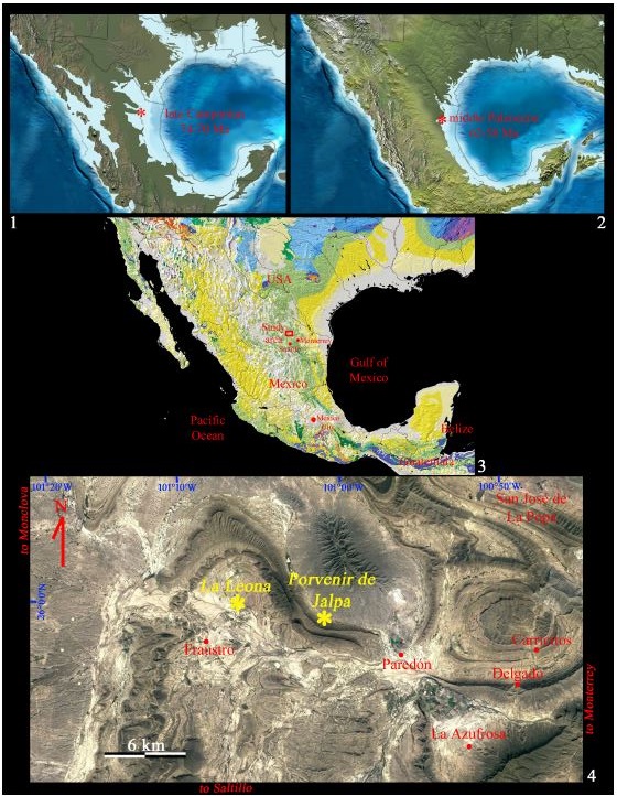The Cerro del Pueblo Formation is the oldest (late Campanian) lithostratigraphic unit of the Parras Basin (McBride et al., 1974, Eberth et al., 2004) and includes shallow sedimentary environments, represented by delta plains, lagoons, and marshes, located in the ancient northeast coast of Mexico (Figure 1.1). Relatively similar environments were found during the Paleocene in this region (Figure 1.2). A diversity of marine, freshwater, and terrestrial animals has been described from several localities in NE Mexico (Figure 1.3).Perrilliat et al. (2008) reported important fossiliferous outcrops of the Cerro del Pueblo Formation. Its lithology and fossiliferous content is similar to the locality here described as Las Águilas/Porvenir de Jalpa, General Cepeda, Coahuila (25°31ʹ03ʺN, 101°40ʹ30ʺW) (Figure 1.4), also from the Cerro del Pueblo Formation. In the latter, light-brown, fine-grained sandstone beds yield hematizedgastropods, bivalves, tortoise bones, crocodile teeth, coprolites, wood fragments, and fruits, preserved under anoxic, stagnant freshwater deposits. Estuarine, non-hematized gastropods are also found a few meters above level with hematized remains. The freshwater strata are relatively thin and interbedded in cyclic sequences with shallow marine sediments that include the ostreoidFlemingostrea subspatulataForbes, 1845 and the ammoniteSphenodiscus sp.