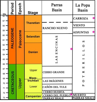 Salt tectonics played an important role in facies distribution and occurrence, mainly at La Popa Basin (Giles and Lawton, 1999, 2002; Lawton et al., 2001, 2009). This halokinetic control was important, especially during Paleocene times, in the formation of small, closed shallow basins. In these zones, organic matter accumulated in estuarine to freshwater environments, and aquatic continental gastropod populations developed.