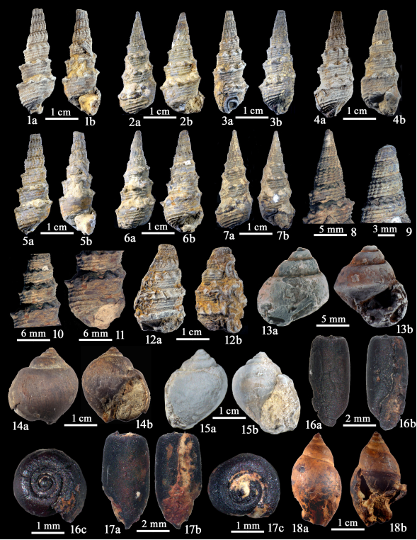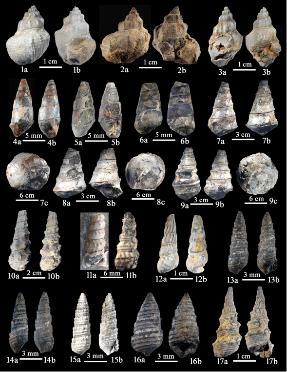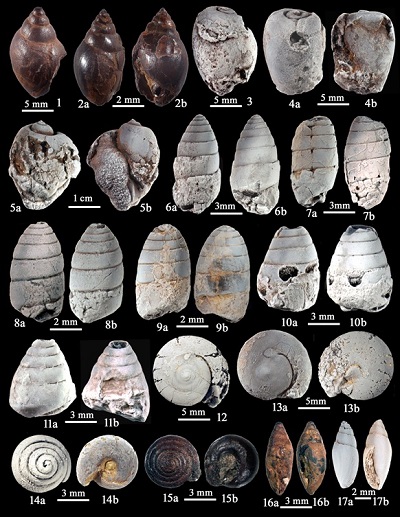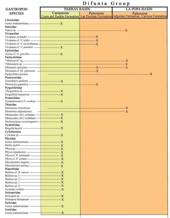 Four species of freshwater gastropods were reported byPerrilliat et al. (2008) from red beds (delta plain) of the Las Encinas Formation (Parras Basin). The Paleocene Adjuntas, Viento and Carroza formations in La Popa Basin also contain continental gastropods. These specimens were found in delta-plain deposits, with some species in common with those from the Paleocene of Las Encinas Formation (Figure 2).