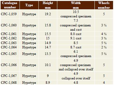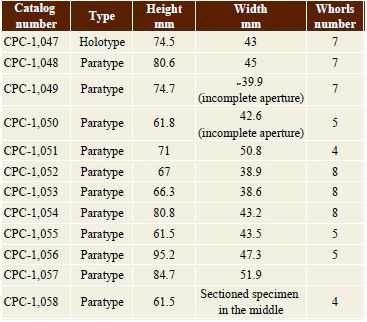 Material examined. Three specimens, CPC- 2166, height = 28.1 mm, width = 26.6 mm, whorls = 3; CPC-2167, height = 30.2 mm, width = 25.6 mm, whorls = 3; CPC-2168, height = 42.5 mm, width = 33.6 mm, whorls = 3.