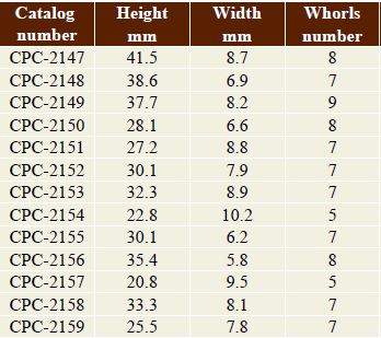 Material examined. Four specimens, CPC- 1038, height = 9.9 mm, width = 3.2 mm, whorls = 7; CPC-1039, height = 10.3 mm, width = 3.9 mm, whorls = 4; CPC-1040, height = 10.3 mm, width = 3.2 mm, 8 whorls; CPC-1041, height = 5.4 mm, width = 2.5 mm, whorls = 6.