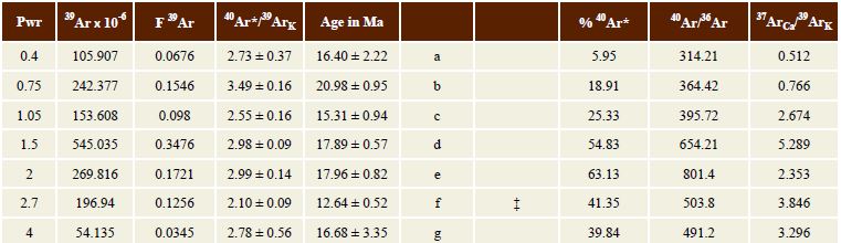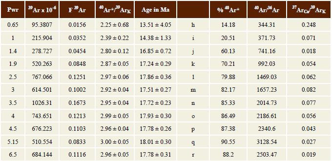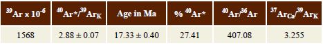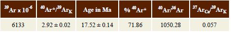 The dated sample (SP-120) comes from a granitoid body that is associated with prograde skarn mineralization in the area of Zacatepec, northeastern Oaxaca. The40Ar/39Ar results are listed in Table 1 and presented in Figure 2. The analyzed sample yielded an isochron age at 17.52 ± 0.14 Ma for biotite and an isochron age at 17.33 ± 0.40 Ma for hornblende (early Miocene).