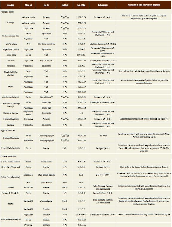 The host volcanic rocks to the Taviche Au-Ag-Zn-Pb (Taviche, El Cubilete, El Carmen-San Ignacio, La Altona, Verónica-San Juan, San Martin, San Jorge-Colmena and Los Ocotes veins) and the Lachigalla Au-Ag epithermal deposits were dated at 22.31 ± 0.03 Ma (Iriondo et al., 2004). Thus, plausible ages for these deposits are <22.31 Ma.