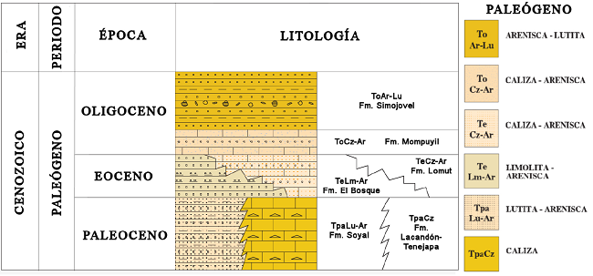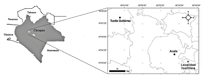 La madera fósil se recolectó en un afloramiento que pertenece a la Formación El Bosque. La localidad es conocida como “Las maderas Acala”, ubicada a 10 km al sureste del municipio de Acala, Chiapas, siguiendo la carretera 101, entre las coordenadas 92° 43’ 47” N y 16° 30´ 41” O (Figura 1). Los sedimentos de la Formación El Bosque se componen de una secuencia de aproximadamente 37 metros de limolitas, lutitas, areniscas (Figura 2) y en ocasiones conglomerados polimícticos (Juárez-Hernández, 2014). En esta formación geológica se han encontrado una diversidad de fósiles representados por invertebrados marinos como son gasterópodos, bivalvos y equinodermos; vertebrados (vertebras de tiburones, tortugas); algas calcáreas y restos de plantas como maderas permineralizadas (familia Anacardiaceae), infiriendo que los sedimentos pertenecen a un ambiente cercano a una costa de mar tropical (Perrilliat et al., 2006; Juárez-Hernández, 2014; Pérez-Lara et al., 2017).