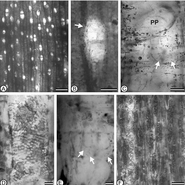 Los vasos presentan un diámetro tangencial de 160 (110-212) μm, con un espesor de la pared de 12 (6-15) μm. Placas de perforación simple con una inclinación de 65º respecto al plano horizontal (Figura 3C). Punteaduras intervasculares alternas que miden 5 (4-6) μm de largo (Figura 3D). Las punteaduras vaso-radio con bordes reducidos de forma redondas, alargadas horizontal, vertical y diagonalmente (Clase b según Richter), presentan una longitud de 13.8 (9-20) μm (Figuras 3C y 3E). Los elementos de vasos presentan una longitud de 494 (341-646) μm (Figuras 3D y 3F). Presencia de tílides con forma de burbujas (Figuras 3B, 3D y 3F).