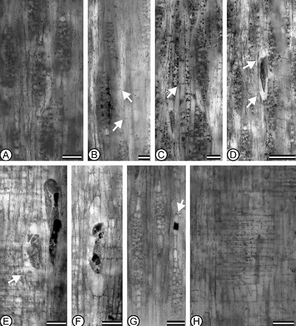 Presencia de células oleíferas con forma alargada, se encuentran principalmente entre las fibras, muy rara vez asociados a los márgenes de los radios, con una longitud de 248 (130-446) μm y 53 (39-79) μm de ancho (Figuras 4D a 4G). Las células oleíferas que se encuentran en los márgenes de los radios fueron observadas únicamente en corte tangencial (Figura 4G), en el plano radial no se encontraron.