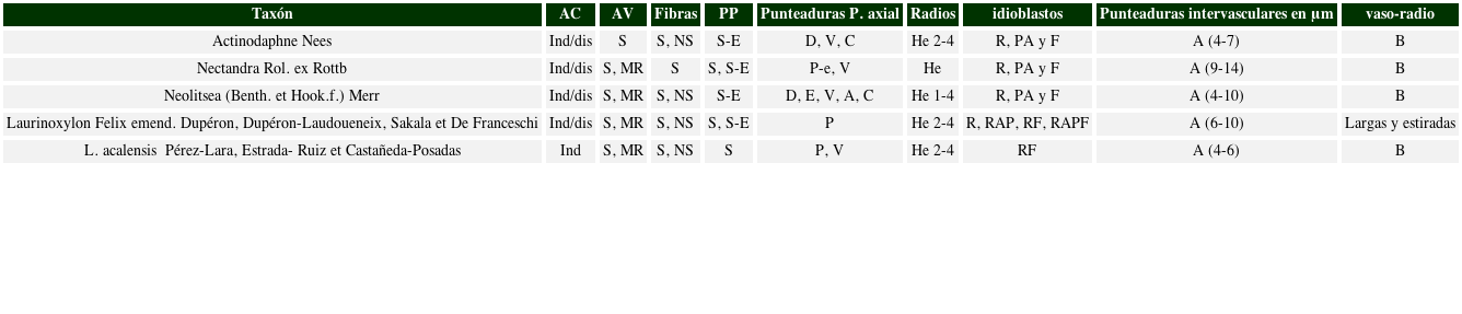 En México, se han recolectado maderas y hojas relacionadas con Lauraceae en sedimentos del Cretácico Superior de las formaciones Olmos y San Carlos en el norte de México, así como dos registros de maderas del Mioceno de Tlaxcala y Chiapas (e.g., Weber, 1978; Castañeda-Posadas et al., 2009; Estrada-Ruiz et al., 2010; Flores-Rocha et al., 2013; García-Hernández et al., 2016). Relacionado con el estudio de la anatomía de madera se han descrito un total de 5 especies afines a esta familia. Para la Formación Olmos (Campaniano tardío), Coahuila se han descrito 2 maderas; la primera de ellas está relacionada al grupo Phyllanthoide/Lauraceae la cual a diferencia de nuestra madera presenta radios heterocelulares con una o dos hileras de células erectas, la longitud y diámetro de los vasos es mucho menor (150 μm y 69 μm respectivamente) y punteaduras intervasculares romboidales (Cevallos-Ferriz y Weber, 1992). Más tarde, Estrada-Ruiz et al. (2010) describen un nuevo género y especie para la familia, nombrándolo Olmosoxylon upchurchii Estrada-Ruiz, Martínez-Cabrera et Cevallos-Ferriz, la cual presenta células oleíferas asociadas únicamente a los radios, radios homocelulares y heterocelulares compuestos por una hilera de células cuadradas, y punteaduras intervasculares de mayor tamaño, siendo diferente de Laurinoxylon acalensis. Para la Formación San Carlos (Coniaciano-Maastrichtiano), Chihuahua se reporta la presencia de Paraphyllanthoxylon anasazi Wheeler, McClammer et LaPasha la cual difiere por tener radios heterocelulares con una hilera de células cuadradas, y la ausencia de células oleíferas (García-Hernández et al., 2016). Para el centro del país se ha descrito la presencia de Argapaloxylon richterii Castañeda-Posadas, Calvillo-Canadell et Cevallos-Ferriz en sedimentos miocénicos de la localidad La Mina, Tlaxcala, la cual presenta anillos de crecimiento delimitados por parénquima marginal, traqueidas vasicéntricas, punteaduras vaso-radio ovoides y opuestas, cristales en la fibras y radios homocelulares (Castañeda-Posadas et al., 2009), siendo claramente diferente de nuestra madera. Finalmente, para el Mioceno de Chiapas de describe una madera con afinidad a Lauraceae la cual a diferencia de nuestra madera presenta un porcentaje mayor de vasos solitarios (80 %), radios con una sola hilera de células erectas, cristales en las células marginales de los radios, y ausencia de parénquima vasicéntrico (Flores-Rocha et al., 2013).