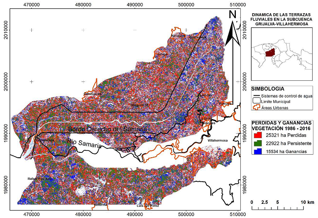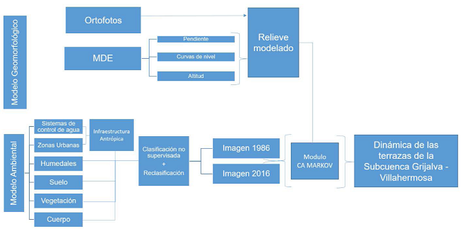 Los criterios ambientales (humedales, cuerpos de agua, vegetación, suelo e infraestructura antrópica) para el desarrollo del diagnóstico ambiental de la dinámica de las terrazas fluviales fueron identificados por medio de una clasificación no supervisada de las imágenes Landsat de 1986 Enhanced Thematic Mapper (ETM) y 2016 Operational Land Imager (OLI) con una resolución de 15 m, las cuales fueron posteriormente reclasificadas para el análisis de tendencia de cambio (CA_MARKOV). El diagnóstico ambiental se basó en el medio natural y antrópico en la zona de estudio, que consistió en la evaluación del cambio en la cobertura de humedales (ecosistema), cuerpos de agua, vegetación (pastizales y cultivos), suelo e infraestructura antrópica (sistemas de control de agua y zonas urbanas), los cuales representan los sistemas ambientales característicos en la desembocadura de la Subcuenca Grijalva-Villahermosa. El relieve obtenido del proceso de reclasificación y fotointerpretación fue integrado en este paso del modelo SIG. La resolución espacial de las imágenes Landsat permitió diferenciar la heterogeneidad de comunidades vegetales en la clasificación de humedales (Barba-Macías et al. 2006; Guerra-Martínez y Ochoa-Gaona, 2008).