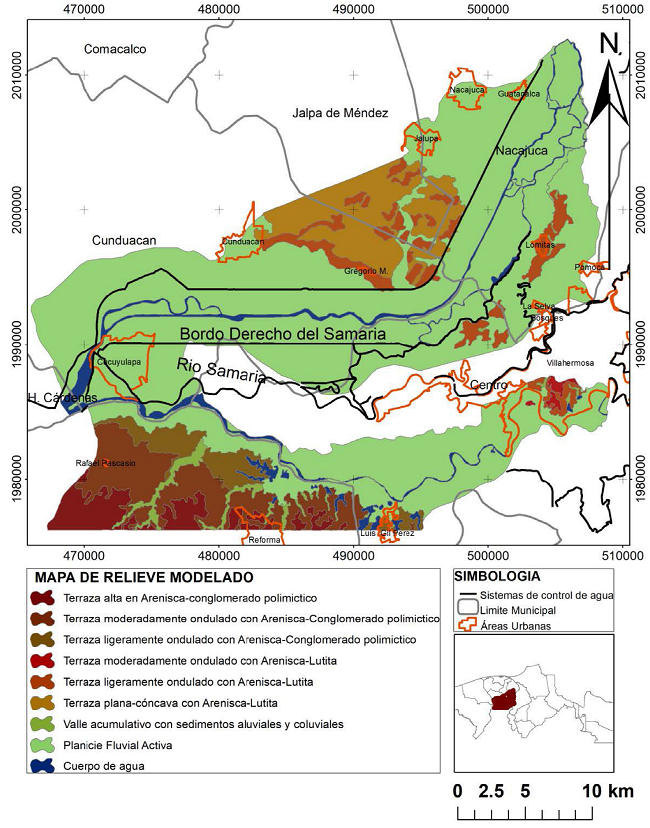 El área de estudio, de acuerdo con Zavala-Cruz et al. (2016) predominan dos paisajes geomorfológicos: Planicie Fluvial Activa y Terrazas Costeras, los cuales se constituyen por la acumulación de sedimentos del cuaternario holoceno dando lugar a la región fisiográfica Llanuras Costeras del Golfo Sur donde se encuentra la Cuenca Grijalva-Usumacinta. Ésta presenta una gran diversidad de regiones ecogeográficas: planicies inundables, terrazas fluviales y terrazas aluviales, valles, colinas y laderas. Por ello, la gestión o manejo adecuado de planicies y áreas inundables debe dirigirse a reducir los efectos destructivos de las crecidas, a preservar y enaltecer los valores naturales y proveer criterios para la utilización óptima de los recursos terrestres y acuáticos de las planicies inundables.
