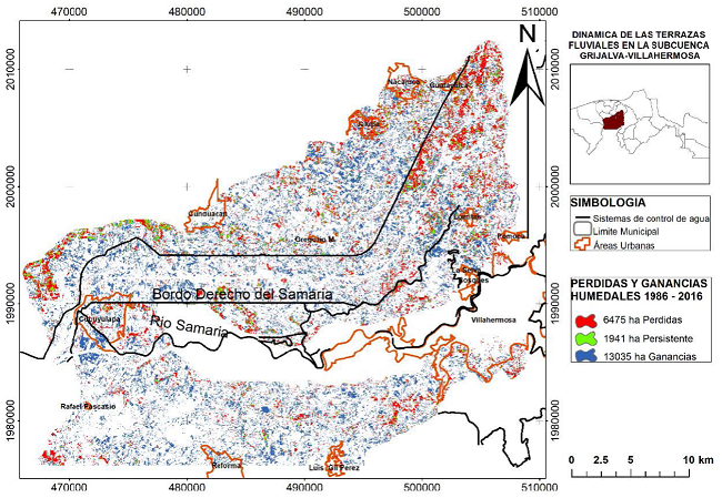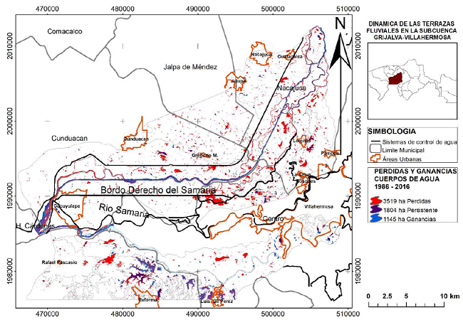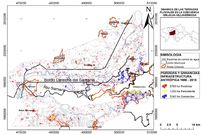 En la Figura 7 se pueden observar la relación de pérdidas y ganancias estimadas en el periodo de análisis de la infraestructura antrópica. Como respuesta a los sistemas de control de agua, se registró un crecimiento significativo (3242 ha) de zonas urbanas en la Subcuenca Grijalva-Villahermosa. Sin embargo, las pérdidas rebasan ligeramente a las ganancias (3793 ha), debido a que el crecimiento de zonas urbanas se ha dado en áreas donde no se inundaba constantemente, en particular en la zona sur de la Subcuenca, lo cual puede indicar un aumento en la vulnerabilidad de la población a las inundaciones.
