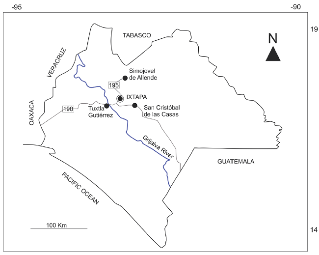 The Ixtapa fossiliferous site is located at the coordinates 16°48ʹ42.31ʺN, 92°54ʹ33.58ʺW, 28 km east from Tuxtla Gutiérrez City. This site is exposed at the east side of the Soyaló-Ixtapa highway (State Road 195), next to the bridge that goes through the Río Hondo, one-kilometer North from down-town Ixtapa (Figure 1).