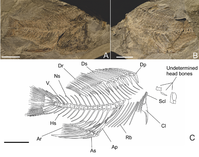 The specimen described here is deposited in the National Collection of Paleontology of Mexico (Colección Nacional de Paleontología), at the Autonomous National University of Mexico (Universidad Nacional Autónoma de México). This fossil fish preserves partially both part and counterpart and contains only undefined isolated bones on the head. Furthermore, it lacks the anterior portion of the vertebral column, the pectoral and pelvic fins, and the tip of the dorsal, anal, and caudal fins.